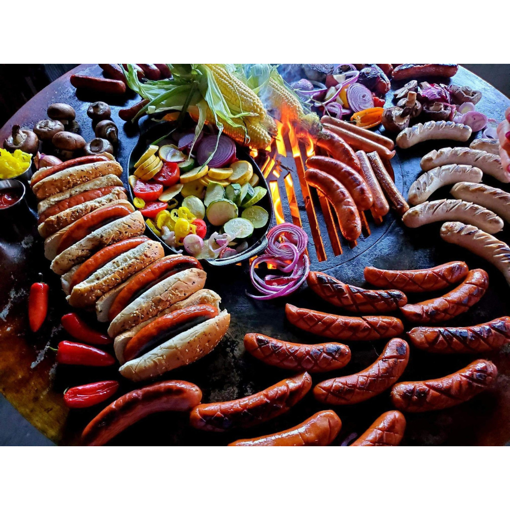 Building a wood or charcoal fire in the center of the grill, the cook top heats from the center out.