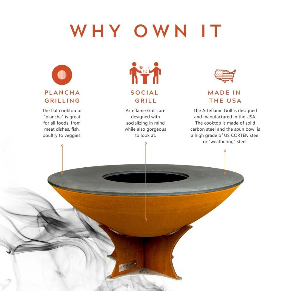 The Arteflame Euro 40" grill is a one of a kind grilling experience. The cooktop is made of 1/2" carbon steel and the spun bowl is a high grade of US CORTEN steel or "weathering" steel.
