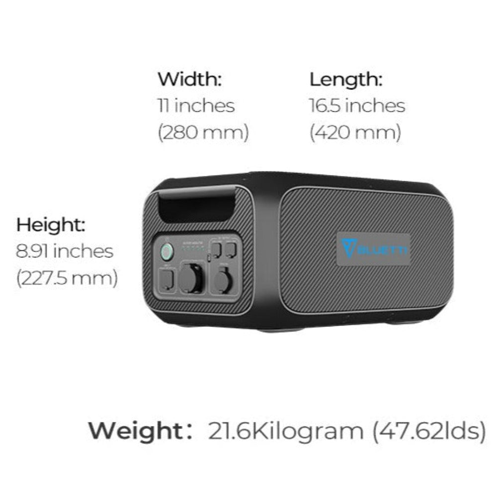 - Solar Input: 500W Max., VOC 12-60VDC, 10A (Via BLUETTI D050S)