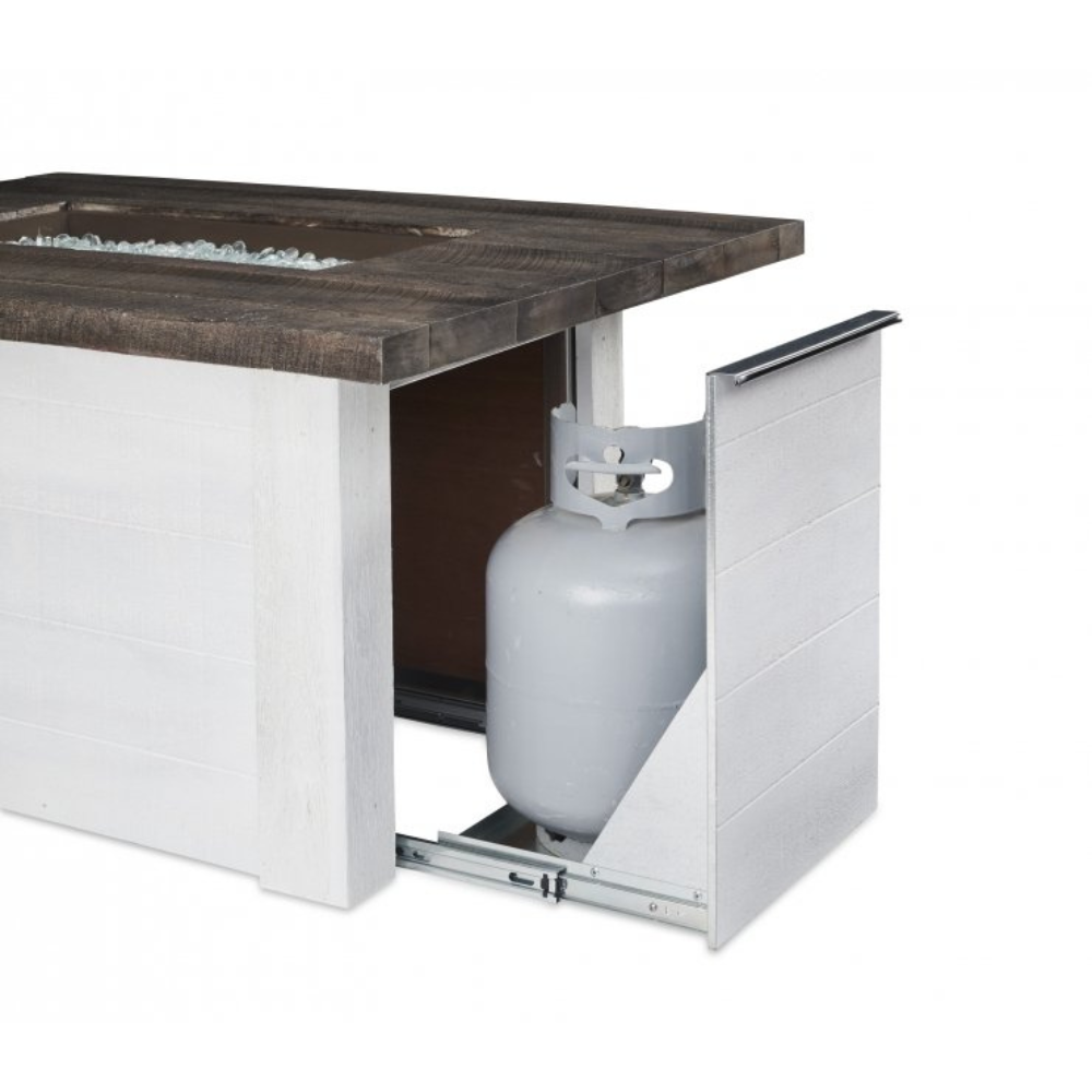 The Alcott Fire Pit Table portrays a modern farmhouse aesthetic. This unique fire table features an Antique Timber Supercast™ concrete top with a white-washed shiplap base.
